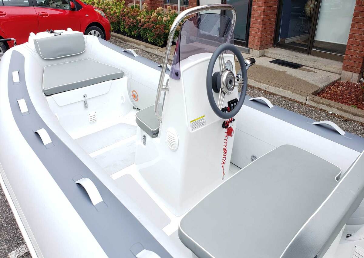 The A400L, measuring 400 cm in length, is equipped with a steering console, a double seat, and a large bow locker with a cushion, offering plenty of storage space and comfortable seating.